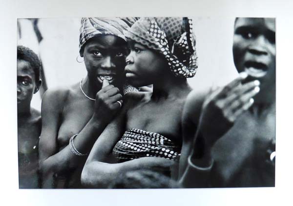 Vogel, Walter: Ohne Titel. 4 afrikanische Frauen. Der Untergrundkarton nachgedunkelt und etwas fleckig, ein kleiner Seiteneinriss. Der Abzug mit geringen Narben und leichten Kratzsuren in der Bildfläche. Foto auf Passepartoutkarton vom Fotografen aufgezogen und verso gestempelt. Sonst wohlerhalten. Silbergelantineabzug auf Fotokarton, Schwarz-Weiss. Foto 39,4 x 58,7 cm. Karton 47,5 x 65,5 cm. Zeigt vier afrikanische Frauen, die sich offenbar von der Tatsache, fotografiert zu werden, überrascht zeigen. Um 1970 – 1975. Verso dem Trägerkarton mit Stempel des Fotografen.