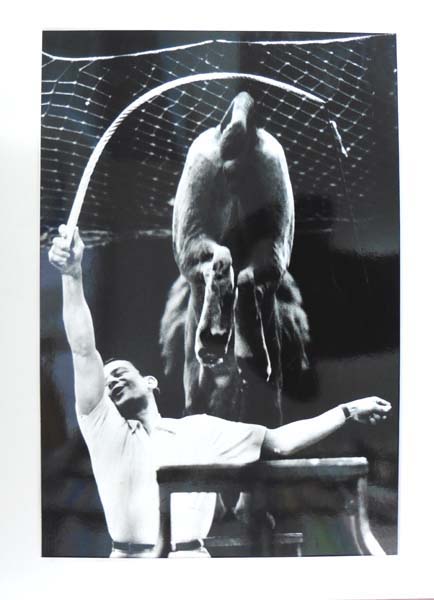 Vogel, Walter: Ohne Titel. Zirkus. Der Untergrundkarton nachgedunkelt, der Abzug mit geringen Narben und dezenten Kratzspuren in der Bildfläche, Foto vom Fotografen auf Fotokarton aufgezogen. Sonst wohl erhalten. Silbergelantineabzug auf Fotokarton, Schwarz-Weiss, lose in Passepartout. Foto 58,5 x 38,8 cm. Karton 66,5 x 48,0 cm. Gibt eine Löwendressur im Zirkus wieder. Um 1970 – 1975. Verso auf dem Trägerkarton mit Stempel des Fotografen.