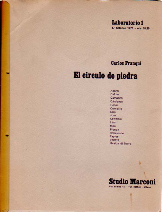 Studio Marconi. Erste Auflage. 4 Galeriekataloge. Milano. Studio Marconi. 1970. 28 x 21 cm. 4 OKarton (gelocht) in OKlemmschiene. Vorderer Einband mit 3 kleinen Fleckchen und minimaler Knickspur, hinterer Einband etwas angestaubt und gering stockig sowie mit wenigen kleinen Fleckchen, Klemmschiene gebräunt. Gutes Exemplar. 4 Galeriekataloge aus dem Jahr 1970 von Studio Marconi aus Mailand als Sammelband. Enthalten sind: Carlos Franqui: El circulo de piedra. 17 ottobre 1970. / Hsiao. 6 novembre 1970. / Gianni Colombo. Ottobre 1970. / James Coleman. Ottobre 1970.