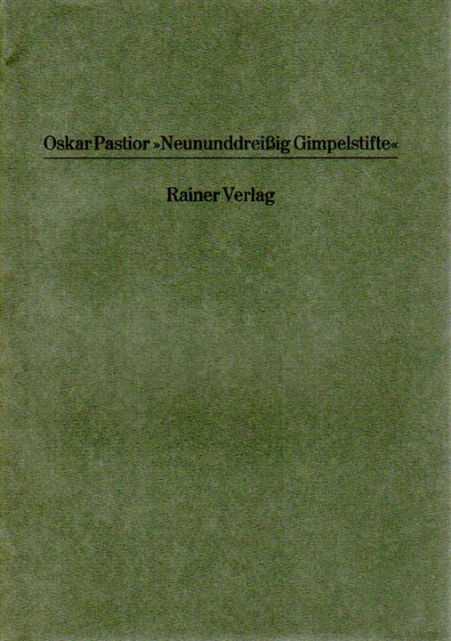 Pastior, Oskar: Neununddreißig Gimpelstifte. Auflage: 160 nummerierte und signierte Exemplare. Berlin. Rainer Verlag. 1990. 30 x 21 cm. 48 unpaginierte S. OEnglisch-Broschur. Kleine Stauchung am oberen Rücken, sonst sehr gutes Exemplar. Im Impressum handschriftlich nummeriertes und von Oskar Pastior signiertes Exemplar, hier die Nummer 61 von 160.