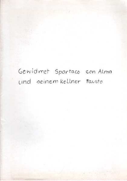 Hoehme, Gerhard [Herausgeber]: Gewidmet Spartaco con Alma und seinem Kellner Fausto. Diese Publikation entstand im Wintersemester 1969/70 an der Staatlichen Kunstakademie Düsseldorf. 1. Auflage. Düsseldorf. Staatlichen Kunstakademie Düsseldorf. 1969. 30 x 21 cm. 96 unpaginierte S. OKarton mit OUmschlag. Sehr gutes Exemplar. Gemeinsam mit ihrem Professor Gerhard Hoehme haben Studentenden der Kunstakademie Düsseldorf dieses ausschließlich aus Fotografien, Versatz- und Textstücken, Collagen und Werkwiedergaben bestehende Künstlerbuch gestaltet. Die Teilnehmer an diesem Projekt waren Elena Engel, Monika Günther, Gerhard Hoehme, Claudia Kinast, Peter Kleemann, Volker Kraemer, Frantisek Kyncl, Charles H. Müller, Gislind Nabakowski, Rolf Niehoff, Wulf Nolte, Angelika Rürup, Jochen Zellmann. Mit einem Forderungsstatement der Beteiligten im Anhang.