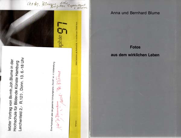 Blume, Bernhard und Anna: Trautes Heim. Fotos aus dem wirklichen Leben. Kunsthalle Basel, 4. Oktober bis 15. November 1987; Kölnischer Kunstverein, 4. März bis 10. April 1988. Erste Auflage. Basel. Kunsthalle Basel. 1987. 30 x 20 cm. [40] unpaginierte S. OKarton. Einband etwas berieben, sonst gutes Exemplar. Mit einem Text von Jean-Christophe Ammann. Durchgehend mit schwarz-weiß Abbildungen versehen, teilweise auf Klapptafeln. Beiliegend ein hektographierter, gefalteter Flyer zum letzten Vortrag von Bernhard Johannes Blume in der HBK Hamburg mit einer handschriftlichen Widmung nebst Signatur in rotem Faserschreiber von Bernhard Johannes Blume für Jo[hanna] Baumann, der Sekretärin von Prof. Carl Vogel an der HBK Hamburg. Ebenso beiliegend eine 12-seitige Ausgabe hors serie des Centre national de la photographie 97 zu Anna & Bernhard Blume, von beiden Künstlern (″A + B. Blume“) signiert und gewidmet.