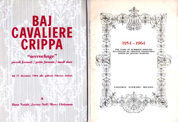 1954 – 1964. Ten Years of numbered editions. Illustrated by Original Engravings. Edited by Arturo Schwarz. Milano. Galleria Schwarz. 1964. 24 x 17 cm. 40 S. OKarton. Umschlag etwas lichtrandig, am Rücken leicht berieben. Gutes Exemplar. Durchgehend mit Abbildungen versehen, teils farbig. Biliegend eine Einladung im Katalogformat zu einer „accrochage“ Baj – Cavaliere – Crippa vom 17.12.1964.