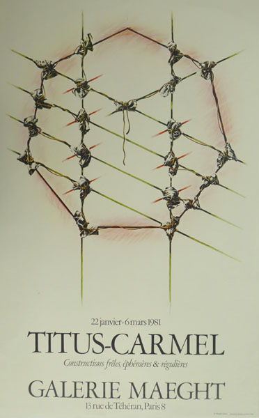 Titus – Carmel, Gerard: Titus – Carmel, Constructions freles, ephémères & regulières. [Plakat / Poster] GALERIE MAEGHT, Paris, 22 janvier – 6 mars 1981. Paris. Galerie Maeght. 1981. 78 x 50 cm. Sehr gutes Exemplar. Gérard Titus-Carmel geboren am 10.10.1942 in Paris. Er ist ein französischer Maler, Dichter, Illustrator und Graveur. Gedruckt von Imprimerie Moderne du Lion, Paris.