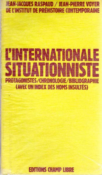 Raspaud, Jean-Jacques [et] Jean-Pierre Voyer: L´internationale situationniste. [Par] Jean-Jacques Raspaud / Jean-Pierre Voyer de l´institut de préhistoire contemporaine. Chronologie, bibliographie, protagoniste (avec un index des noms insulté). Paris. Editions Champ libre. 1972. 22 x 13 cm. 1 Falttafel, 168 S, 2 Blatt. OKarton mit OKlappenumschlag, Pergaminumschlag. Sehr gutes Exemplar. Enthält vorangestellt ein neunteiliges montiertes Leporello mit einer Chronologie von 1956 bis 1969.