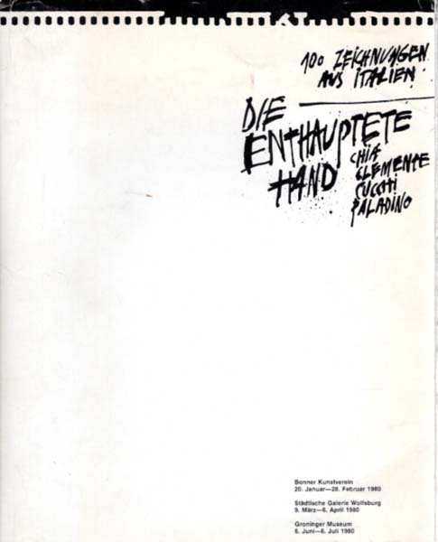Maenz, Paul (Herausgeber): Die enthauptete Hand. 100 Zeichnungen aus Italien – Chia, Clemente, Cucchi, Paladino. Bonner Kunstverein, 20. Januar-28. Februar 1980; Städtische Galerie Wolfsburg, 9. März-6. April 1980; Groninger Museum, 6. Juni-6. Juli 1980. Erste Auflage. 4 Bände. Bonn / Wolfsburg / Groningen. Bonner Kunstverein / Städt. Galerie Wolfsburg / Groninger Museum. 1980. 25 x 20 cm. 4 Bände mit insgesamt 100 S. und 1 Blatt; Textheft mit 11 S.; Übersetzung mit 5 S. Illustrierte OKarton-Mappe. Mappe leicht abgestaubt, berieben und etwas lichtrandig. Innen lichtspurig und etwas nachgedunkelt. Sonst gutes Exemplar. Enthält 4 Hefte in Form von Skizzenblöcken mit jeweils 25 Zeichnungen der Künstler, davon jeweils 1 Zeichnung in Farbe. Textheft mit Beiträgen von Wolfgang Max Faust, Margarethe Jochimsen und Achille Bonito Oliva. Text von Boito Oliva in Italienisch und deutscher Übersetzung. Auflage: 1000 Exemplare.