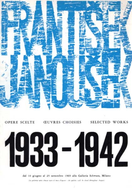Janousek, Frantisek: Opere scelte / Oeuvres choisies / Selected Works 1933 – 1942. Galleria Schwarz, Milano, dal 10 giugno al 25 settembre 1969. Milano. Galleria Schwarz. 1969. 24 x 17 cm. 8 unpaginierte S. OKarton. Umschlag gering lichtrandig, obere Stoßkante minimal gestaucht, sonst gutes Exemplar. Catalogo N. 90. Mit einem Textbeitrag von Jindrich Chalubecky in Italienisch, Französisch und Englisch. Enthält 8 Werkabbildungen, davon 4 farbige.