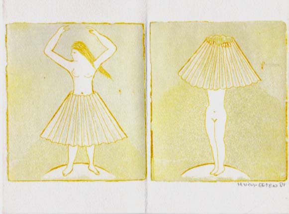 Egten, Henriette van: Achtenachtig Zeignungen 1980-81. [Mit einem Portrait der Autorin von Jan Voss]. Auflage: 20 signierte Exemplare mit Radierung. Berlin. Rainer Verlag. 1981. 15 x 10 cm. [130] unpaginierte S. OHalbleinen mit OUmschlag. Sehr gutes, frisches Exemplar. Eines von 20 im Impressum handschriftlich von Henriette van Egten signierten Exemplaren mit einer lose beiliegenden farbigen Original-Radierung, signiert und datiert 81. Durchgehend mit meist farbigen Abbildungen versehen.