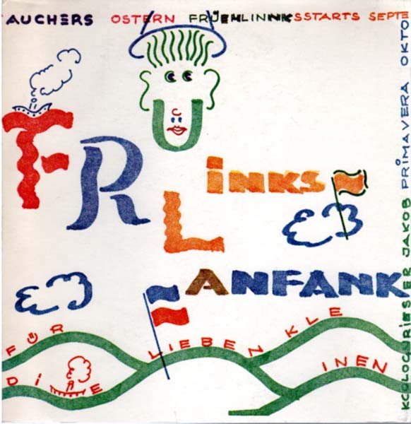 Wewerka, Stefan: Für die Lieben Kleinen. Stefan Wewerka´s Frühlingskindermalbuchwalzer. Herausgeber Diter Roth + Rudolf Rieser. Auflage: 2000 Exemplare. Stuttgart. Köln. London. Edition Hansjörg Mayer. 1969. 22 x 22 cm. 6 Doppelblatt, 2 Blatt. Farbig illustrierter OKarton. Gutes bis sehr gutes Exemplar. 10 Seiten mit Strichzeichnungen Wewerkas, unterlegt mit gedruckten Kurztexten in Margenta.