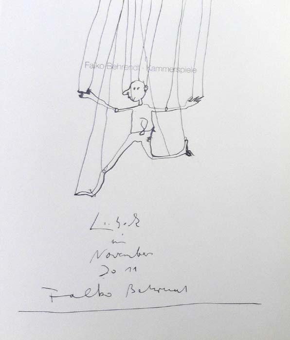 Behrendt, Falko: Kammerspiele. Die schwarzen Blätter. [Einbandvariante „Puppentheater N., Marionettenkopf“ (Ausgabe B)]. Auflage: 400 signierte und nummerierte Exemplare. Seeretz. Privatdruck (herausgegeben von Helmut Schumacher). 2011. 28 x 24 cm. 59 S. OKarton. Sehr gutes Exemplar. Vorsatz mit einer Original-Zeichnung von Falko Behrendt versehen, signiert, datiert „Lübeck im November 2011“. Im Impressum signiertes und nummeriertes Exemplar, hier die Nummer 79 von 400. Mit einem Text von Helmut Schumacher. Durchgehend mit farbigen Abbildungen versehen. Beiliegend: Einladungskarte „Falko Behrendt. Malerei & Graphik. Die Wallstrassen Galerie, Mönchengladbach, 2011“.