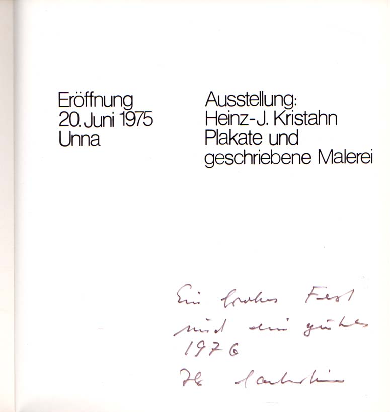 Kristahn, Heinz-J. – Prof. Rolf Sackenheim [Herausgeber]: Plakate und geschriebene Malerei. Eröffnung 20. Juni 1975, Unna. 1. Auflage. Münsterschwarzbach. Vier-Türme-Verlag. 1975. 22 x 20 cm. 98 unpaginierte S. OKarton mit OKlappenumschlag. Klappenumschlag teilweise stärker knitterspurig und mit 2 (sauber hinterlegten) Einrissen, sonst gutes Exemplar. Mit einem Text von Klaus Wember. Durchgehend mit Abbildungen versehen, teilweise in Farbe. Auf dem Titelblatt wünscht Herausgeber Prof. Rolf Sackenheim handschriftlich „Ein frohes Fest und ein gutes 1976“, signiert.