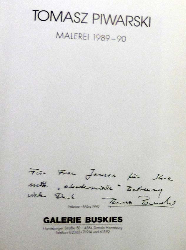 Piwarski, Tomasz: Malerei 1989-90. Galerie Buskies, Datteln-Horneburg, Februar-März 1990. 1. Auflage. Datteln-Horneburg. Galerie Buskies. 1990. 30 x 24 cm. 48 unpaginierte S. OKarton. Einband marginal angestaubt, sonst gutes Exemplar. Handschriftliche Widmung von Tomasz Piwarski auf dem Titelblatt, signiert. Mit einem Text von Ortwin Goertz. Verzeichnet 20 Farbtafeln.