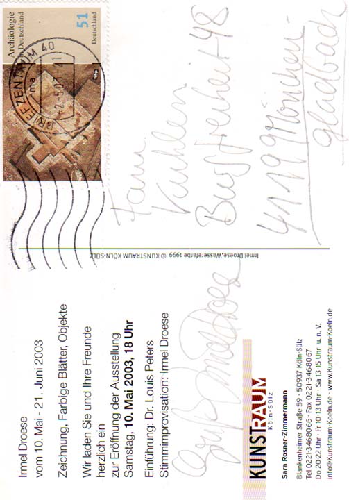 Droese, Irmel: Zeichnung, Farbige Blätter, Objekte. [Einladungskarte / Invitation Card] Kunstraum Köln-Sülz, 10. Mai-21. Juni 2003. Köln-Sülz Kunstraum. 2003. 15 x 10,5 cm. OKarton-Karte. Karte insgesamt etwas gebrauchsspurig. Ordentliches Exemplar. Postalisch gelaufene Einladungskarte, verso handschriftlich von Irmel Droese adressiert und mit Gruß versehen, signiert. Abbildung: Irmel Droese, Wasserfarbe 1999.