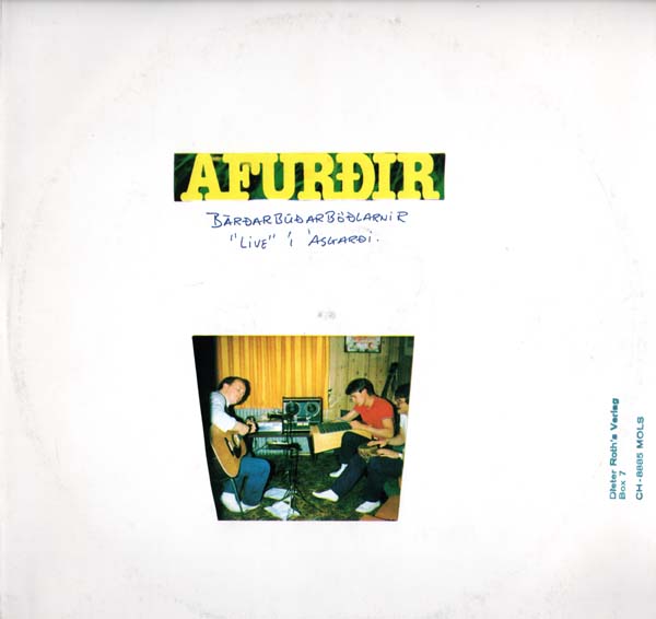 (Roth, Dieter) – Bardarbudarbödlarnir: AFUDIR. Life i Asgardi. [Auflage 100 Exemplare]. JST 262. Stuttgart. Reykjavik. Dieter Roth´s Verlag / Pöpulls Musikk. 1982. 31,5 x 31,5 cm. OKarton-Cover. Cover vorne mit leichtem Staubrand durch den Abdruck der Platte, sonst sehr gutes Exemplar. Cover near mint, Platte near mint / mint. Die Band Bardarbudarbödlarnir probte neben dem Atelierhaus von Dieter Roth in Hellissandur. Er hörtev sie und bot ihnen sofort einen Plattenvertrag an. Die Musik ist eine Mixtur aus Pop, Worldmusic, Copuntry und isländischer Folklore. Cooperation von Pöpulls Musikk und Dieter Roth, Stempel von Dieter Roth´s Verlag rechts am Rand des vorderen Covers. Mit einer Auflage von nur 100 Pressungen heute sehr selten. [Vgl. Dieter Roth und die Musik. Discography – Roth´s Verlag, S.176 mit Abbildungen].