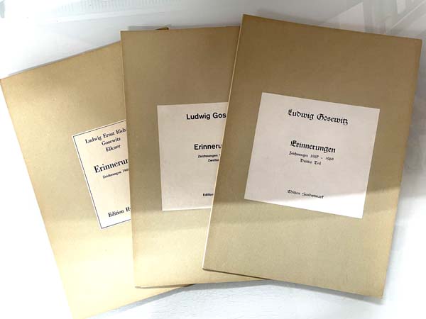 Gosewitz, Ludwig: Erinnerungen. Erster Teil: Zeichnungen 1968 – 1970; Zweiter Teil: Zeichnungen 1967 – 1972; Dritter Teil: Zeichnungen 1967 – 1969. Auflage 200 Exemplare. 3 Mappen. Berlin. Edition Hundertmark. 1970-1973. 33 x 22 cm. 1 Blatt, 15 Tafeln; 2 Blatt, 15 Tafeln; 2 Blatt, 7 Tafeln. OPapp-Mappen. Sehr gutes Exemplar. Die drei Mappenwerke „Erinnerungen“ in der jeweiligen Kopievariante in 200 Exemplaren. Es erschienen ursprünglich jeweils Ausgaben in 20 Exemplaren mit Originalzeichnungen und Fotografien. Vorliegend: Band 1 – Nummer 149/200; Band 2 – Nummer 77 / 200; Band 3 – Nummer 135 / 200. Enthält zusammen 35 Xerox-Kopien von Zeichnungen und 3 Kopien von Fotos.