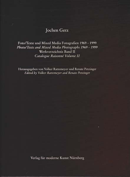 Gerz, Jochen – Volker Rattemeyer und Renate Petzinger [Herausgeber]: Foto/ Texte und Mixed Media Fotografien 1969 – 1999. Werkverzeichnis Band II. Photo/ Texts and Mixed Media Photographs 1969 – 1999. Catalogue Raisonne Volume II. Auflage 1500 Exemplare. Nürnberg. Verlag für moderne Kunst. 2000. 29,5 x 25,5 cm. 393 S., 1 Blatt. OPappband. Einbandkanten mit minimalsten Bereibungen. Sonst sehr gutes Exemplar. Werkverzeichnis der beiden Werkgruppen der Foto/ Texte und der Mixed Media Fotografien (Nummern 133 bis 460, alle abgebildet).