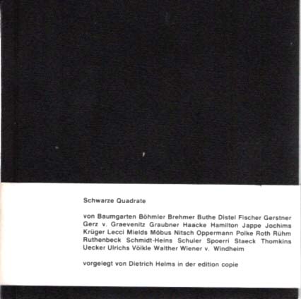 Helms, Dietrich (Herausgeber): Schwarze Quadrate / Black Squares. Vorgelegt von / presented by Dietrich Helms. Auflage 391 Exemplare. edition copie im Verlag zweitschrift. 1979. 14,5 x 14,5 cm. 96 unpaginierte S. Schwarzer OKarton mit weißer Bauchbinde. Sehr gutes, frisches Exemplar. Künstlerbuch. Text in Russisch, Deutsch und Englisch. Durchgehend mit ganzseitigen schwarz-weiß Abbildungen versehen. Die vertretenen Künstler sind Dorothee von Windheim, Franz Erhard Walther, Reiner Ruthenbeck, Michael Buthe, Klaus Staeck, Gotthard Graubner, Christiane Möbus, Richard Hamilton, Hermann Nitsch, Dieter Roth, Daniel Spoerri, Günther Uecker, Sigmar Polke, [und weitere]. Nummer 326 / 391 handschriftlich im Kolophon nummeriert.
