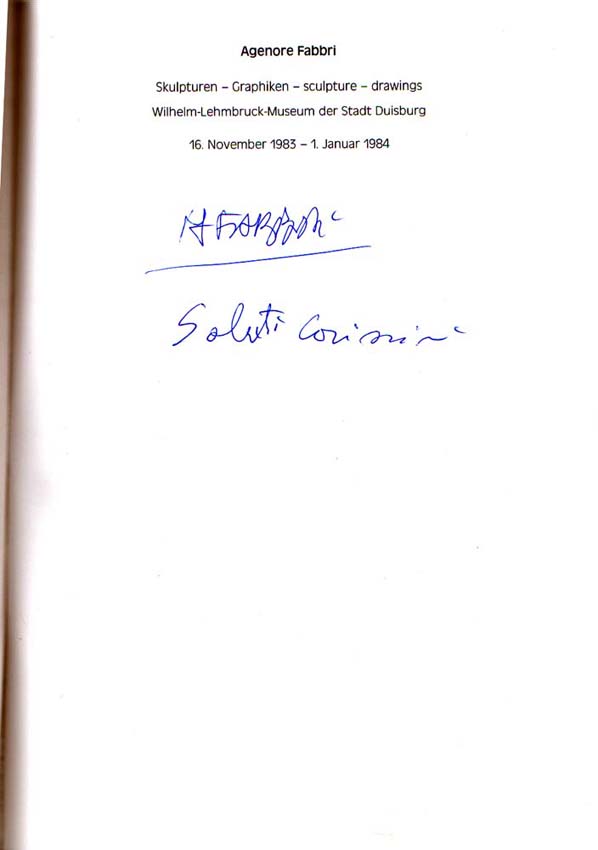 Fabbri, Agenore: Skulpturen – Graphiken – sculpture – drawings. Wilhelm-Lehmbruck-Museum der Stadt Duisburg, 16. November 1983-1. Januar 1984. 1. Auflage. Duisburg. Wilhelm-Lehmbruck-Museum. 1983. 24 x 17 cm. 164 S. OKarton mit Klappen. Gutes bis sehr gutes Exemplar. Auf dem Titelblatt handschriftlich von Agenore Fabbri signiert sowie mit Gruß versehen. Texte in Deutsch und Englisch. Mit Beiträgen von Raffaele Alberti, Siegfried Salzmann, Roberto Sanesi, Marco Valsecchi, [und weitere]. Durchgehend mit Abbildungen versehen, davon viele in Farbe.