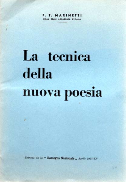 Marinetti, F[ilippo] T[ommaso]: La tecnica della nuova poesia. Prima edizione. Roma. Estratto della „Rassegna Nazionale“. 1937. 24 x 17 cm. 12 S. OBroschur, Klammerbindung. Klammern etwas rostig, dezente Knickspur am oberen Kapital. Umschlag etwas in den Rändern aufgehelt. Gutes Exemplar. Erste Ausgabe als Auszug der Zeitschrift „Rassegna Nazionale“ , mit 9 beispielgebenden Abbildungen im Text. Herausgegeben am 15. April 1937. Typographische Gestaltung von Genio Civile. Text in Italienisch.
