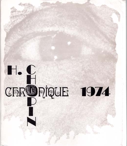 Chopin, Henri: Chronique 1974. Limited to 500 copies. Chelmsford. Selbstverlag. 1975. 27 x 22 cm. 61 paginierte Blatt. OKarton. Sehr gutes Exemplar. COLLECTION OU N° 5. Nummer 194 / 500 handschriftlich in Rot im Kolophon nummerierten Exemplaren. Enthält Gedichte, Texte, Collagen, Typozeichnungen und weiteres von Henri Chopin. Texte in Französich. Mit einer handschriftlichen Widmung Chopins an den Galeristen, Editeur und Verleger Armin Hundertmark auf dem Vorsatz: „For Armin Hundertmark, hommage for your …(unleserlich) in the world, signiert Henri Chopin, datiert 20.5.1995.