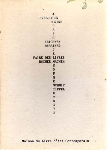 Tippel, Andrea: Schreiben – Ecrire / Zeichnen – Dessiner / Faire des Livres – Bücher machen. Schmit – Tippel. Tire a 600 exemplaires numoerotes. Domart-en-Ponthieu. La Maison du Livre d´Art Contemporain. 1993. 31 x 22 cm. 10 lose Blatt; 16 unpaginierte S.; 30 S., 1 Blatt. OPapp-Kassette. Drei kleine Farbkleckse am vorderen Deckelrand oben von Andrea Tippel zu einer kleinen Blume „verzeichnet“. Sehr gutes Exemplar. Nummer 184 / 600 im Kolophon nummerierten Exemplaren. Auf dem vorderen Innendeckel eine sechszeilige handschriftliche Widmung von Andrea Tippel, datiert 30.9.1993, signiert „Eure Andrea“. Die Kassette enthält von Andrea Tippel das Künstlerbuch „64 Dramolette“ sowie von Tomas Schmit „Die Charlottenburger Schlange“. Dieses war 1990 als handgezeichntes und handkoloriertes Buch in 23 Originalen bei Wiens Verlag erschienen und liegt hier als Faksimile vor. Dabei ferner ein Text von Reinhard Krüger, „Über die Lektüre heutiger Künstlerbücher“ in Deutsch und Französisch auf losen Seiten. Beiliegend: Andrea Tippel. Zeichnungenbeschreibungen. Im März 1989 in der Galerie & Edition Marlene Frei, Zürich, in 500 Exemplaren erschienen. 77 S., 1 Blatt, OKarton.