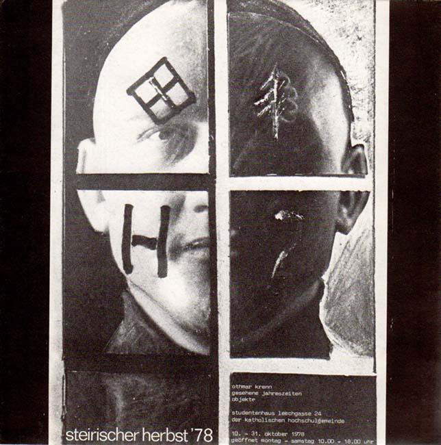 Krenn, Othmar: gesehene jahreszeiten objekte. [Einladung / Invitiation Card] steirischer herbst ’78. studentenhaus der katholischen hochschulgemeinde, 10.-31. oktober 1978. [Graz]. Studentenhaus der katholischen Hochschulgemeinde. 1978. 20 x 20 cm. 12-seitige OKlappkarte. Insgesamt leicht angestaubt, sonst gutes Exemplar. Mit Abbildungen in Schwarz-Weiß sowie Textbeiträgen von Kurt Jungwirth, Wilfried Skreiner, Georg Herold und Othmar Krenn.