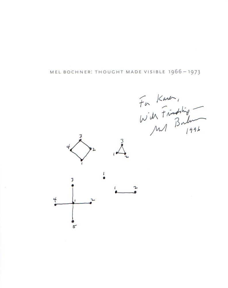 Bochner, Mel – Richard S. Field: THOUGHT MADE VISIBLE 1966-1973. With essays by Brude Boice, Yve-Alain Bois, Rosalind E. Krauss, Frederik Leen, James Meyer, Sasha M. Newman, Robert Pincus-Witten, Jessica Prinz, Ulrich Wilmes, William S. Wilson. [Yale University Art Gallery, New Haven, 14 October-31 December 1995; La Societe des Expositions du Palais des Beaux-Arts, Brussels, 1 March-12 May 1996; Städtische Galerie im Lenbachhaus, Munich, 26 June-8 September 1996]. 1. Auflage. 2 Bände. Yale University Art Gallery. 1995. 27 x 23 cm. 318 S., 1 Blatt. OKarton mit Klappen (Softcover). Band 1 Rücken etwas aufgehellt und lesespurig, Einbandkanten teilweise etwas berieben; Band 2 hinterer Deckel etwas knickspurig und berieben. Gutes Exemplar. Auf dem Vorsatz mit einer kurzen handschriftlichen Widmung sowie einer kleinen Zeichnung in schwarzer Tinte von Mel Bochner, signiert, datiert 1996. Die Zeichnung, 9 x 9 cm, entspricht dem Duktus von Bochners konzeptueller Raumanordnung. Texte in Englisch. Durchgehend mit schwarz-weiß Abbildungen versehen. Dabei der anläßlich der Ausstellung im Lenbachhaus, München, 1996 erschienene Katalog „MEL BOCHNER: SICHTBARGEMACHTES DENKEN 1966-1973“ mit der deutschen Übersetzung der Texte. Dem Katalog liegt die Einladungskarte zur Ausstellung bei, diese ebenfalls mit einer handschriftlichen Widmung von Bochner versehen, signiert und datiert 1996. In dieser Form schönes und auch seltenes Ensemble.