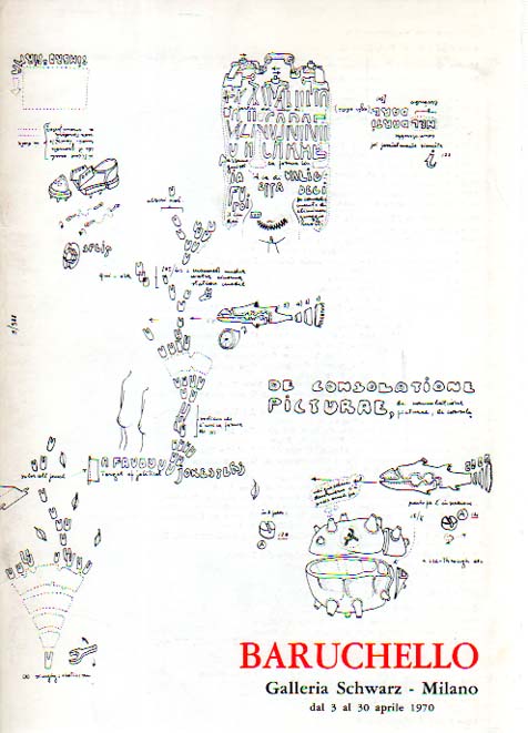 Baruchello, Gianfranco: BARUCHELLO. Galleria Schwarz – Milano, dal 3 al 30 aprile 1970. 1. Auflage. Milano. Galleria Schwarz. 1970. 24 x 17 cm. 36 S. OKarton (Softcover). Einband etwas nachgedunkelt und angestaubt sowie an den Kanten teilweise gering bestoßen, sonst gutes Exemplar. Catalogo n. 97. Text in Italienisch, Französisch und Englisch. Mit einem Gespräch zwischen Umberto Eco und Gianfranco Baruchello. Enthält 18 Abbildungen, davon 8 in Farbe. Beiliegend: Einladungskarte „BARUCHELLO. SUR LA CONTRADICTION PRINCIPALE. PEINTURES“, Galerie Craven, Paris, 7 mars au 7 avril 1973.