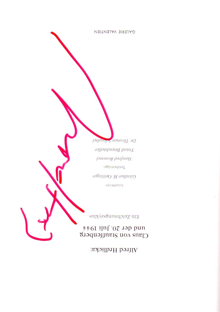 Hrdlicka, Alfred: Claus von Stauffenberg und der 20. Juli 1944. Ein Zeichnungszyklus. Grußwort: Günther H. Oettinger. Textbeiträge: Manfred Rommel, Trautl Brandstaller, Dr. Thomas Schnabel. Auflage: 1500 Exemplare. Stuttgart. Galerie Valentien. 2005. 30 x 22 cm. 43 S. OKarton. Sehr gutes Exemplar. Titelblatt großflächig von Alfred Hrdlicka handschriftlich signiert. Durchgehend mit farbigen Abbildungen versehen.