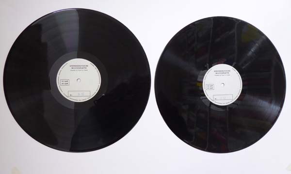 Kriwet, Ferdinand: (Campaign). 2 Promoschallplatten. 12“ Vinyl Langspielplatten. (Düsseldorf). (Ferdinand Kriwet). (1974). 31,5 x 31,5 cm. 2 LP´s. OPapier-Sleeves. Sleeves etwas gebrauchspurig, Platten sehr gut erhalten. Sleeves very good, Platten near mint. Zwei Promoversionen des dreiteiligen Albums „Campaign ´72“, hier bezeichnet als Platte 2 A und 2 B sowie 3 A und 3 B. Platte 2 A enthält (vermutlich in der gleichen Folge): Introduction / Democratic National Convention, 2 B National Republican Convention / Presidential Election Campaign. Das entspräche eigentlich Platte 3 (=C) der Campaign-Kassette oder der Auskopplung C, die ebenfalls 1974 erschien. Die Platte 3 A und 3 B entspricht der tatsächlichen Platte B, „Richrad Milhouse Nixon: Acceptance Speech. Analytical Cut“. Beide Langspielplatten sind Promos und als „Unverkäufliche Musterplatten“ gekeinzeichnet, hergestellt bei Taunus Ton Technik. Die Box sowie die Auskopplung erschienen 1974 dann bei Droste Verlag, Düsseldorf. Die handschriftlich auf dem Label angegebenen Nummern sind nicht unbedingt identisch mit der später gepressten Folge der Platten (nicht komplett eruiert). Die Platten sind als Promos nicht nachweisbar und stammen aus dem Nachlass Ferdinand Kriwets. Ein Sleeve enthält einen Adressstempel Kriwets aus der Düsseldorfer Zeit. [Vgl. Schuelke / Deutzmann, Ferdinand Kriwet Bibliographie, Nummer 18 respektive 18.1 (dort auch nur die tatsächliche Pressung im Droste Verlag].