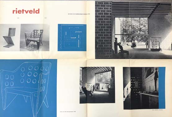 Rietveld, Gerrit: rietveld. Exhibition 6 maart – 6 april. Stedelijk Museum Amsterdam, 6 maart – 6 april 1959. Cat. 205. 1. Auflage. Amsterdam. Stedelijk Museum Amsterdam. 1959. 52 x 75 cm. Illustrierter OKarton. Papier leicht nachgedunkelt, sonst sehr gutes Exemplar. Ein gefaltetes Blatt als Katalog (52 x 75 cm). Illustrationen: Rietveld + Schröder-Schräder zeigen zwei Gebäude von 1924; Rietveld Stuhl 1957 und Ahrend Stuhl 1918; zwei Rietveld Stühle von 1934 und 1942, zwei Fotos von Sonsbeek Pavillon 1954; ein Foto Violette Cornelius und zwei architektonische Pläne. Durchgehend mit Abbildungen versehen. Texte in Niederländisch.