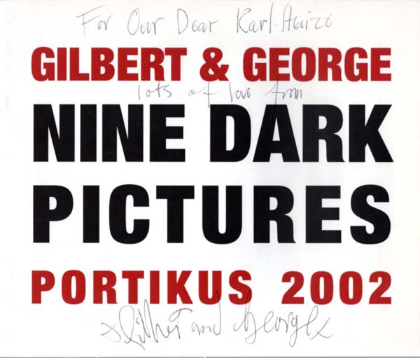 Gilbert & George: Nine Dark Pictures. Portikus 2002. 1. Auflage. Frankfurt am Main. Portikus. 2002. 25 x 30 cm. [17] unpaginierte S. Flexibler, illustrierter OKarton. Einband ganz leicht lichtschattig und minimalst wellig, sonst gutes Exemplar. Durchgehend mit farbigen Abbildungen versehen. Katalog zur gleichnamigen Ausstellung im Portikus, Frankfurt am Main, vom 23. März bis zum 28. April 2002. Mit Texten von Michael Bracewell und Wolf Jahn in deutscher und englischer Sprache. Auf dem Buchdeckell eine handschriftliche (Kugelschreiber) Widmung nebst Signatur der Künstler für einen Düsseldorfer Künstlerkollegen.