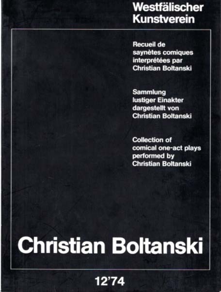 Boltanski, Christian: Recueil de saynetes comiques interpretees par Christian Boltanski. – Sammlung lustiger Einakter dargestellt von Christian Boltanski. – Collection of comical one-act plays performed by Christian Boltanski. 3.4. – 4.5.1975, Württembergischer Kunstverein, Stuttgart. Erste Auflage. Stutgart. Württembergischer Kunstverein. 1975. 22 x 17 cm. S.482 – 573 (=48 Blatt). OKarton. Kanten gering berieben, kleine Risstelle am Rücken mit Knitterungen. Gutes Exemplar. Mit einleitendem Text von Klaus Honnef, „Versuch über Boltanski“ in Deutsch, Englisch und Französsich sowie zu jedem Einakter Fotos der Darstellungen Boltanskis. [Vgl. Calle, S. 36; Flay Nr. 37, jeweils mit Abbildung].
