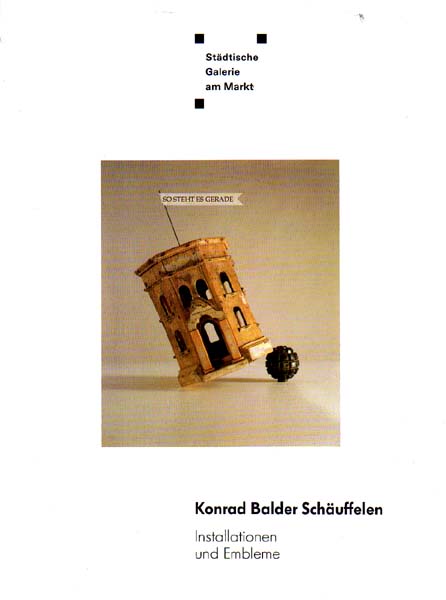 Schäuffelen, Konrad Balder: Installationen und Embleme. 16. Februar – 31. März 1991. Städtische Galerie am Markt, Schwäbisch Hall. Erste Auflage. Schwäbisch Hall. Städtische Galerie am Markt. 1991. 24,5 x 16,5 cm. 32 S. OKarton. Einband leicht berieben, sonst gutes Exemplar. Erschienen anlässlich der Ausstellung der Städtische Galerie am Markt, Schwäbisch Hall, 16. Februar – 31. März 1991. Durchgehend mit farbigen Abbildungen versehen. Mit einer handschriftlichen Widmung an den Verleger Armin Hundertmark, datiert auf den 16.3.91, signiert mit „Balder“.