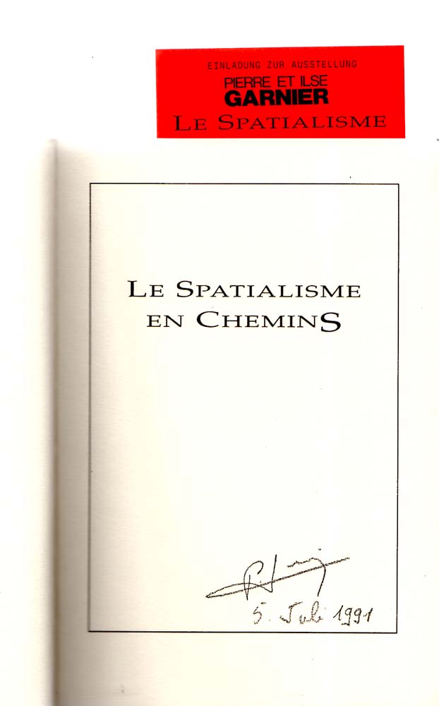 Garnier, Ilse [und] Pierre: LE SPATIALISME EN CHEMINS. 1. Auflage. Amiens. Editions Corps Puce. 1990. 24 x 17 cm. 189 S., 1 Blatt. OKarton. Einband angestaubt, sonst gutes Exemplar. Auf dem Vorsatz handschriftlich von Pierre Garnier in Bleistift signiert sowie datiert 5. Juli 1991. Text in Französisch. Durchgehend mit schwarz-weiß Abbildungen versehen. Beiliegend: Einladung zur Ausstellung „PIERRE ET ILSE GARNIER: LE SPATIALISME . – TEXT – MANIFEST – GRAFIK –“, Buch Julius, Stuttgart, 6. Juli bis 2. August 1991.