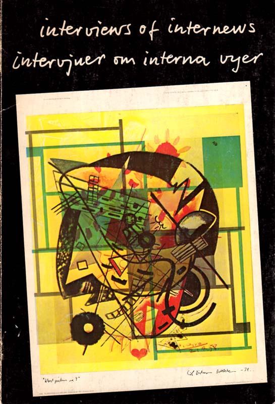 Adlers, Bengt: INTERVIEWS OF INTERVIEWS / INTERVJUER OM INTERNA VYER. [Ben Vautier, Robert Filliou, L G Lundberg, Erik Dietman, Stefan Wewerka, Carl Magnus, George Brecht, Andre Thomkins, Mats B, Carl Frederik Reuterswärd, Dorothy Iannone]. 1. Auflage. Lund. Kalejdoskop Förlag. 1978. 24,2 x 16,5 cm. 47 S. OKarton. Einband stärker berieben, Schnitt bzw. Seitenränder etwas nachgedunkelt, sonst gutes Exemplar. Texte in Englisch und Schwedisch. Durchgehend mit schwarz-weiß Abbildungen versehen.