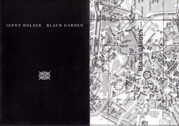 Holzer, Jenny: Black Garden. Empfang für die Künstlerin anläßlich der Einweihung des umgestalteten Kriegerdenkmals in einen Black Garden und die Eröffnung der Ausstellung in der Städtischen Galerie. Freitag, den 28.10.1994, 20.00 Uhr. Nordhorn. Städtische Galerie. 1994. 17 x 12 cm. [3] unpaginierte Blätter. Illustrierter OKarton. Sehr gutes Exemplar. Einladungsklappkarte mit einer schwarzweißen Abbildung zu einer Installation der amerkanischen Konzeptkünstlerin Jenny Holzer (*1950) in Nordhorn. Beiliegend eine Anfahrtsinformation in gleichem Format.