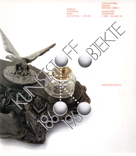 Kölsch, Hans Ulrich (Herausgeber): Kunststoff-Objekte 1860-1960. Sammlung Kölsch. Erste Auflage. Essen. Museum Folkwang. 1983. 24,2 x 21,2 cm. 99 S. Illustrierter, glanzkaschierter OKarton. Einband wenig angestaubt, Rücken aufgehellt. Sonst gutes Exemplar. Durchgehend mit meist farbigen Abbildungen versehen. Katalog zur gleichnamigen Ausstellung der Sammlung Kölsch im Museum Folkwang in Essen, vom 20. November 1983 bis zum 1. April 1984 sowie in Kunstgewerbemuseum der Stadt Zürich, Museum für Gestaltung, vom 7. Juni bis zum 26. August 1984.