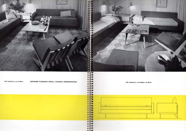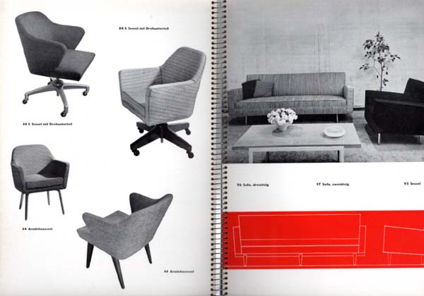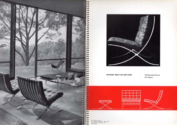 [Matter, Herbert]: Knoll International GmbH. Erste Auflage. Stuttgart. Knoll International GmbH. Ca. 1957. 30,3 x 22,7 cm. Ca. [80] unpaginierte Seiten. Illustrierter, glanzkaschierter OPappband mit Spiralbindung. Einband wenig angestaubt, minimalst berieben und etwas fleckig. Sonst gutes Exemplar. Durchgehend mit schwarz-weißen und wenigen farbigen Abbildungen versehen. Thematisch bestimmte Zwischenblätter aus glanzkaschierter, in jeweils unterschiedlichen Farben gestalteter Pappe trennen die einzelnen Abteilungen und Fotostrecken. In der hinteren Innentasche weitere sechs Blätter mit beidseitigen Entwürfen als Ergänzung. Von Herbert Matter entworfener Verkaufskatalog der damals, etwa 1957, in Stuttgart ansässigen Designfirma Knoll International GmbH. Die Firma setzte international Maßstäbe für das moderne Möbeldesign des 20. Jahrhunderts, mit Designern wie Harry Bertoia, Eero Saarinen, Ludwig Mies van der Rohe, Isamu Noguchi, George Nakashima, Franco Albini oder Ilmari Tapiovaara, die für Knoll arbeiteten. Seltener und gesuchter Katalog.