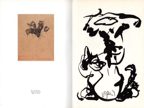 Heil, Axel: An so einem Tag … 17.11. – 8.12.91. Kunstverein Bretten. Erste Auflage. Bretten. Kunstverein. 1991. 24 x 16,2 cm. [30] unpaginierte S. OKarton mit illustriertem OPappumschlag. Umschlag lichtspurig, etwas angestaubt und am Rücken aufgehellt. Sonst noch gutes Exemplar. Durchgehend mit meist farbigen Abbildungen versehen. Katalog zur gleichnamigen Ausstellung des Künstlers im Kunstverein Bretten, vom 17. November bis zum 8. Dezember 1991. Der Umschlag ist ein Siebdruck des Künstlers, zwei weitere Siebdrucke eingebunden. Letztere jeweils im Bildmotiv signiert. Zusätzlich auf der Innenklappe des Umschlags recto vom Künstlers mit einer signierten Widmung in Bleistift für einen Düsseldorfer Künstlerkollegen und Kurator versehen. Eines von 500 Exemplaren der Normalausgabe.
