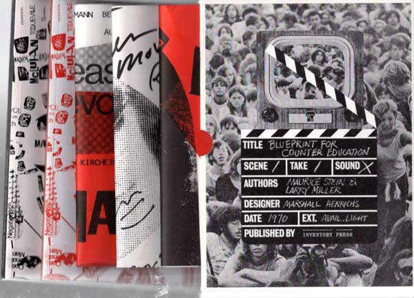 Stein, Maurice / Miller, Larry: Blueprint for Counter Education. Curriculum – Handbook – Wall Decoration – Shooting Script. Erste Auflage dieser Ausgabe. New York. Inventory Press. 2016. 26,9 x 19,7 x 5,5 cm. 79 S.; [96] unpaginierte Blätter; [3] unpaginierte Blätter. Illustrierte OKartonbände in illustriertem OPappschuber. Schuber minimalst nachgedunkelt, sonst noch sehr gutes Exemplar. Durchgehend mit schwarz-weißen Abbildungen versehen. Der erweiterte Reprint des 1970 erschienenen Werkes umfasst zwei Bände und drei Poster in einem Pappschuber. „Blueprint for Counter Education is one of the defining (but neglected) works of radical pedagogy of the Vietnam War era. Originally published in 1970 and integrated into the design of the Critical Studies curriculum at CalArts, the book was accompanied by large graphic posters that could serve as a portable learning environment for a new process-based model of education, and a bibliography and checklist that map patterns and relationships between radical thought and artistic practices—from the avant-gardes to postmodernism—with Marcuse and McLuhan serving as points of anchorage. Accompanying this new facsimile edition of the book, posters, and slipcase is a 80-page book featuring a conversation with the original Blueprint authors Maurice Stein, Larry Miller, and designer Marshall Henrichs, as well as essays from Jeffrey Schnapp, Paul Cronin, and notes on the design by Adam Michaels of Project Projects“ (Verlagsinfo Inventory Press).