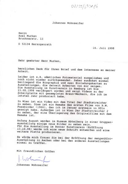 Wohnseifer, Johannes: Maschinenschriftliches Anschreiben. o. O. [Erftstadt]. 1998. DIN-A-4. [1] unpaginierte S.; [4] unpaginierte S. Zweifach gefaltet, sonst guter Zustand; kleiner Rostfleck auf den Schreiben der Galerie Capitain. Maschinenchriftliches, handsigniertes Anschreiben des deutschen Künstlers Johannes Wohnseifer (*1967) an Axel Murken, in dem er Auskunft über einige neuere Arbeit erteilt. Verso ein Adressaufkleber des Künstlers. Beiliegend eine vierseitige Ausstellungsübersicht nebst Bibliographie zum Künstler auf dem Briefpapier der Kölner Galerie Gisela Capitain.