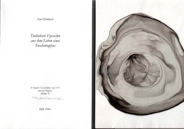 Heimbach, Paul: Turbulente Episoden aus dem Leben eines Tuschetropfens. 36 kopierte Tuscheblätter von 1979 und ein Original. Auflage 36. Erste Auflage. Köln. o. V. [Selbstverlag]. 1996. 29,8 x 21,3 cm. [38] unpaginierte Blätter. Private OSichtüllenmappe mit Halbleinenkaschierung und montierter Titelei. Einband wenig angestaubt und minimal nachgedunkelt, sonst noch sehr gutes Exemplar. Künstlerbuch von Paul Heimbach (1946 – 2013) bestehend aus einer Sichthüllenmappe mit 36 auf semitransparentem Pergaminpapier kopierten Tuscheblättern nebst einer originalen Tuschezeichnung auf leichtem Karton. Letztere verso signiert und datiert „1979“. Aus einer Auflage von 36 Exemplaren, hier Exemplar Nr. 15/36. Vom Künstler auf der Titelseite in Bleistift signiert und nummeriert. [Vgl. Paul Heimbach: Werkverzeichnis der Bücher und Auflagenobjekte. Books & Editions 1967 – 2008. Catalogue Raisonné. Köln 2009, S. 47 (dort abgebildet)].