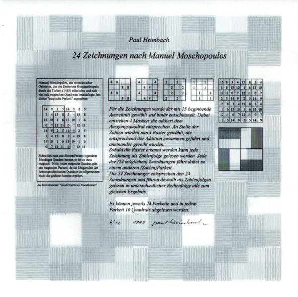 Heimbach, Paul: 24 Zeichnungen nach Manuel Moschopoulos. Erste Auflage. o. O. o. V. [Selbstverlag]. 1995. 30 x 30 cm. [25] unpaginierte Blätter. OPappfolder in schwarzem Plattenhüllenfolder, eingelegt in transparentem Plastikumschlag mit montierter Titelei. Sehr gutes Exemplar. Künstlerbuch von Paul Heimbach (1946 – 2013) bestehend aus einer Sammlung von 24 schwarzweissen Kopien von Zeichnungen auf Transparentpapier. Titelblatt vom Künstler in schwarzem Faserschreiber signiert, datiert und nummeriert. Eines von 12 Exemplaren, hier Exemplar Nr. 6/12. [Vgl. Paul Heimbach: Werkverzeichnis der Bücher und Auflagenobjekte. Books & Editions 1967 – 2008. Catalogue Raisonné. Köln 2009, S. 43 (dort abgebildet)].