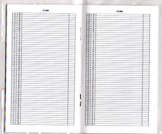 Heimbach, Paul: Neuauflage des Tageskalender. Erste Auflage. Köln. o. V. [Selbstverlag]. 1998. 15,8 x 9,4 cm. [14] unpaginierte S. Klammergeheftete OBroschur in weißer Plastikmäppchen. Wenige produktionsbedingte Abklatschspuren des Drucks, sonst gutes Exemplar. Künstlerbuch von Paul Heimbach (1946 – 2013) bestehend aus einem kleinen Tageskalender für 24 Stunden, verteilt auf 24 Seiten, eingelegt in ein weißes Plastikmäppchen (Terminkalender). Laserdruck auf Papier. Eines von 100 Exemplaren.Neuauflage des 1992 erschienenen Tageskalenders. [Vgl. Paul Heimbach: Werkverzeichnis der Bücher und Auflagenobjekte. Books & Editions 1967 – 2008. Catalogue Raisonné. Köln 2009, S. 40 (dort abgebildet)].
