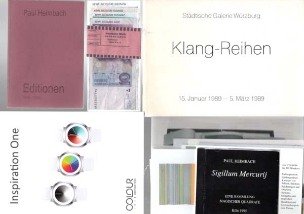 Heimbach, Paul: Lesezeichen [kleiner Satz mit 4 Banknoten]. [Ephemera und kleine Kataloge von Paul Heimbach]. Erste Auflage. Köln. o. V. [Selbstverlag]. 1998ff. Unterschiedliche Formate. [4] unpaginierte Blätter; [12] unpaginierte Blätter; [26] unpaginierte S.; 28 S.; 18 S.; 13 S.; [15] unpaginierte S. Klammergehefte OBroschuren; fadengeheftete Broschur. Gute bis sehr gute Exemplare. Kleine Künstleredition „Lesezeichen“ von Paul Heimbach, bestehend aus verkleinerten Farbkopien von DM-Banknoten auf Papier (10 DM, 20 DM, 50 DM 100 DM) [Vgl. Paul Heimbach: Werkverzeichnis der Bücher und Auflagenobjekte. Books & Editions 1967 – 2008. Catalogue Raisonné. Köln 2009, S. 49 (dort abgebildet)]. Beiliegend 12 diverse Postkarten zu Ausstellungen und Editionen des Künstlers, desweiteren eine Werbebroschüre für die vom Künstler entworfenen Uhren der Firma „Colour Inspiration“, ein kleiner Katalog zu den Editionen Heimbachs von 1998 – 2002, der Ausstellungskatalog „Klang-Reihen“ der Städtischen Galerie Würzburg aus dem Jahr 1989, ein unbekannter Katalog mit schwarzweissen Abbildungen von Ausstellungsbesuchern in einem Atelier sowie ein Sonderdruck des Textes „Ästhetischer Prozess und Rationalisierung. Die „Quadratbücher“ von Paul Heimbach. Hintergrund und Umfeld“ aus dem Jahre 1990. Einladungskarten nebst Briefumschlägen z. Tl. signiert von Heimbach.