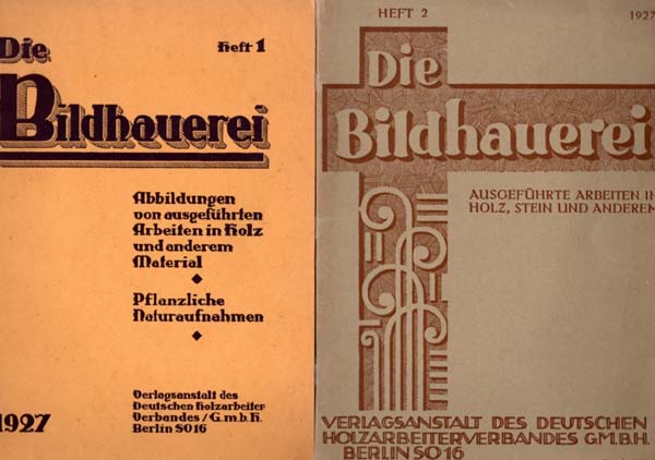 (Blossfeldt, Karl): Die Bildhauerei. Heft 1. 1927 / Die Bildhauerei. Heft 2. 1927. Abbildungen ausgeführter Arbeiten in Holz und anderem Material. Pflanzliche Naturaufnahmen. Erste Auflage. 2 Bände. Berlin. Verlagsanstalt des Deutschen Holzarbeiter-Verbandes GmbH. 1927. 31 x 22,7 cm. 32 S.; 32 S. Illustrierter, klammergehefteter OKarton. Einbände etwas angestaubt, nachgedunkelt und wenig berieben. Innen etwas lichtspurig und minimalst angestaubt. Sonst gute Exemplare.