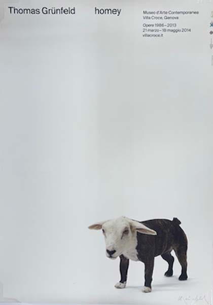 Grünfeld, Thomas: homey. Museo d’Arte Contemporanea. Villa Croce, Genova. Opere 1986 – 2013. 21 marzo – 18 maggio 2014 [Plakat]. Genua. Museo d’Arte Contemporanea. 2014. 96,5 x 68 cm. [1] unpaginiertes Blatt. Sehr gutes Exemplar. Farbiges Plakat im Offsetdruck auf leichtem, glatten Karton zu einer großen Retrospektive Thomas Grünfelds im Museo d’Arte Contemporanea, Villa Croce, in Genua im Jahre 2014. Abgebildet ist ein Werk der Serie der „Misfits“, bestehend aus einem Hundekörper und einem Lammkopf. Vom Künstler in Bleistift unterhalb des Bildmotivs unten rechts signiert.