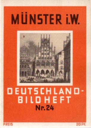 (Renger-Patzsch) – Bund Deutscher Verkehrsverbände (Herausgeber): Münster i. W. Deutschland-Bildheft Nr. 24. Berlin-Tempelhof. Universum-Verlagsanstalt. Ca. 1933. 15 x 11,6 cm. 48 S. Klammergehefteter OKarton. Einband minimalst angestaubt. Innen gleichmäßig nachgedunkelt. Sonst gutes Exemplar. Durchgehend mit schwarz-weißen Abbildungen, teilweise nach Aufnahmen von Albert Renger-Patzsch, versehen. Text in deutscher Sprache, Bildunterschriften auch in englischer und schwedischer Sprache.