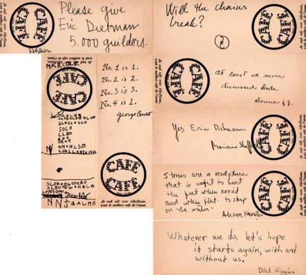Dietmann, Erik: Galerie 20/d. Keizersgracht 518. Amsterdam. 13 dec. 1966 – 1967 15 jan. Erste Auflage. Amsterdam. Galerie 20/d. 1966. 12,6 x 15,5 cm. [13] unpaginierte Blätter. Luftpostumschlag. Umschlag etwas knittrig und mit kleinem Ausriss. Notizpapier nachgedunkelt. Karten etwas lichtspurig. Sonst noch gute Exemplare. Konzeptuelles Multiple als Katalog zu einer Einzelausstellung des schwedischen Künstlers Erik Dietmann (1937 – 2002) in der Amsterdamer Galerie 20/d im Jahre 1966, bestehend aus einem Luftpostumschlag (geöffnet) mit der gedruckten temporären „Adresse“ des Künstlers in der Galerie, fünf Postkarten mit schwarzweißen Abbildungen nach Arbeiten des Künstlers mit Infotext verso sowie acht Blättern eines Notizblocks mit dem Werbeaufdruck der französischen Kaffeemarke „Cafe – Cafe“ mit kleinen Dedikationen bzw. Schreibarbeiten von befreundeten Fluxuskünstlern wie Dick Higgins, George Brecht, Alison Knowles und Robert Filliou.